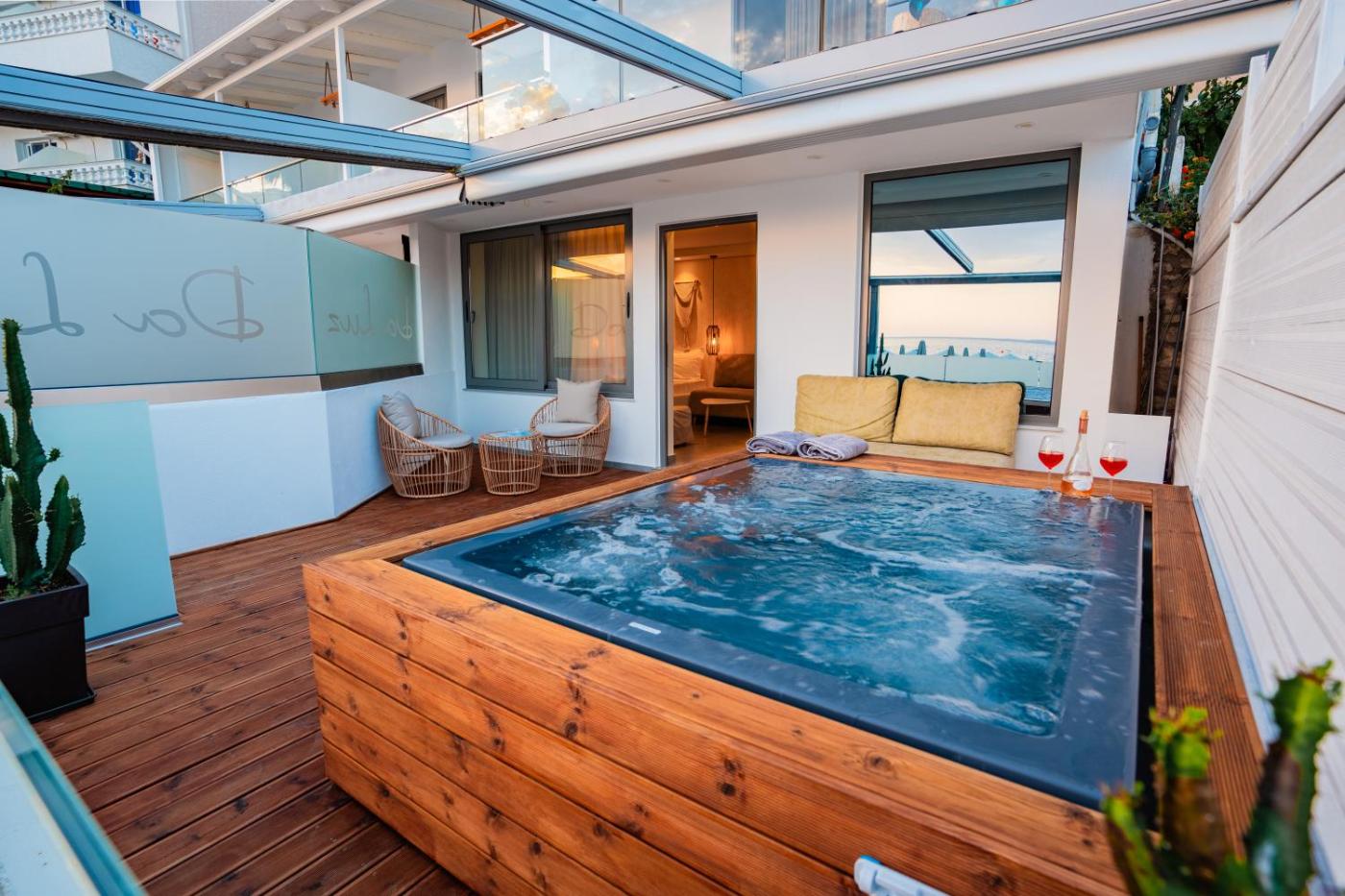 Deluxe Suite with Sea View. This suites special feature is the hot tub. This air-conditioned suite consists of 1 living room, 1 separate bedroom and 1 bathroom with a bath or a shower. This suite features soundproof walls, flat-screen TV, sea views, as well as chocolate for guests. The unit offers 2 beds. ;